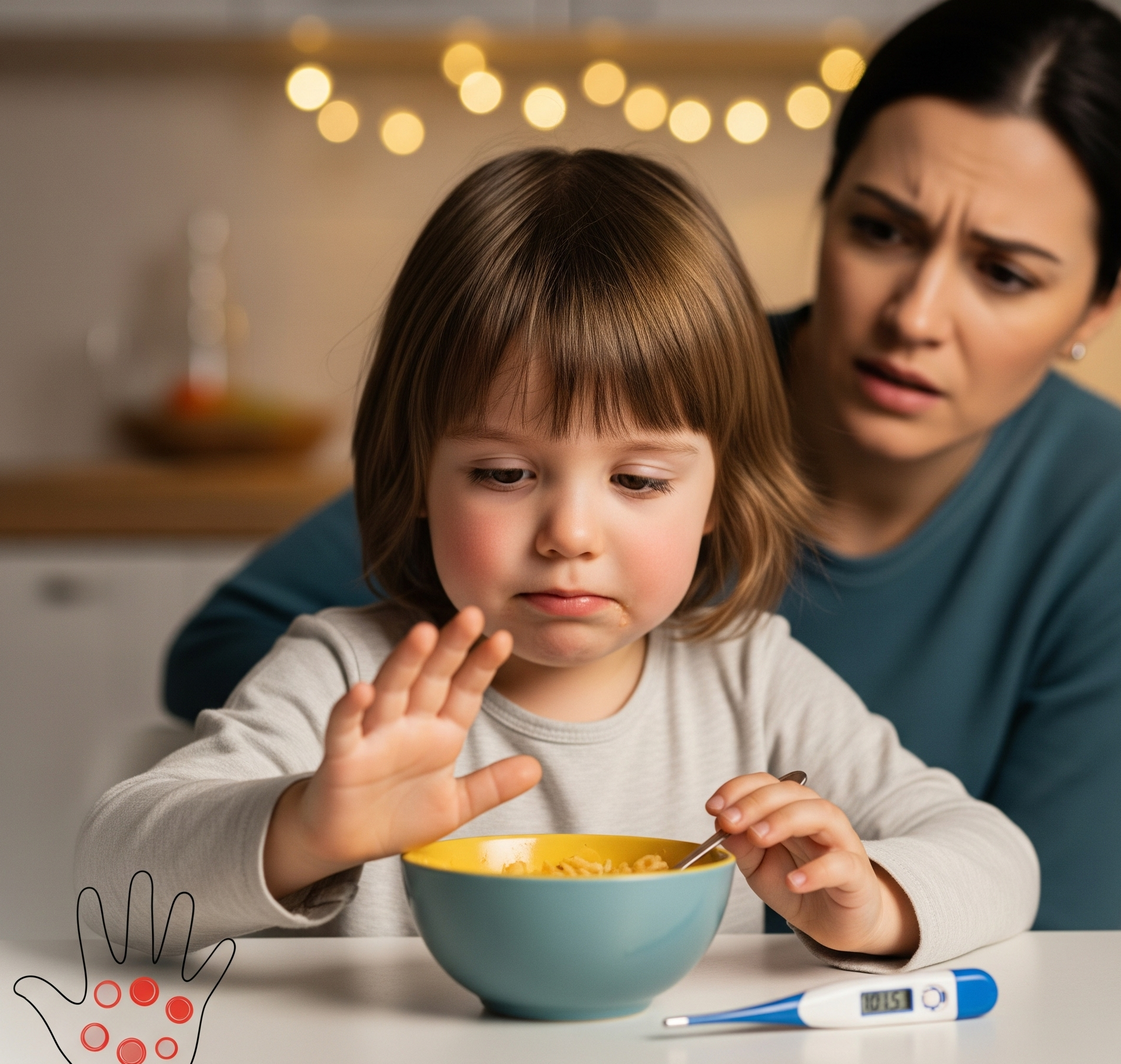 손바닥과 발바닥에 3~7mm 크기의 붉은 발진이 생기고, 입안에는 수포성 궤양이 나타나 삼키기 힘들어합니다. 겉으로 보이는 발진이 없더라도 아이가 밥을 거부한다면 입안을 직접 확인하는 것이 중요합니다.