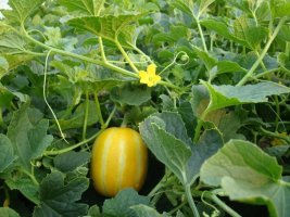 원줄기는 덩굴식물로 옆으로 길게 뻗어 자라며 꽃은 황색으로 6~7월에 피며 열매는 장과로 5~10cm의 크기로 달리며