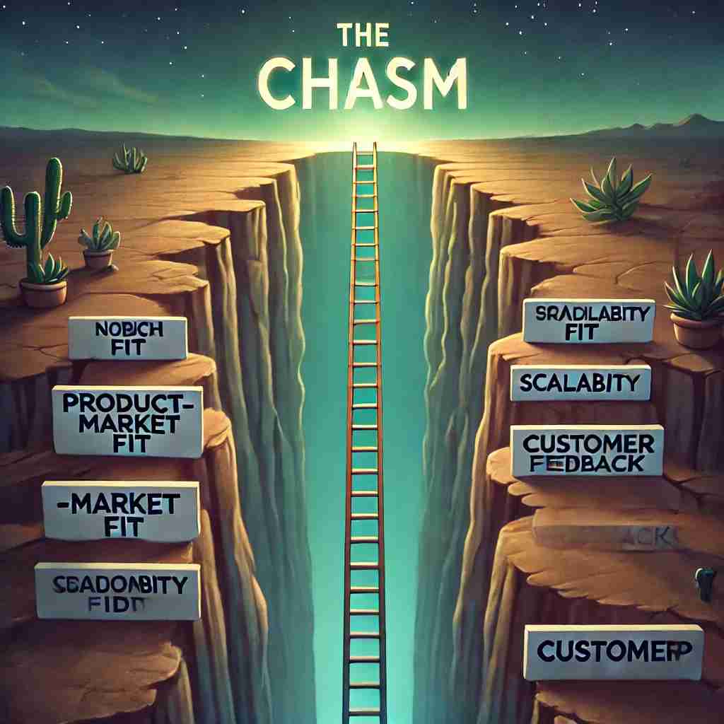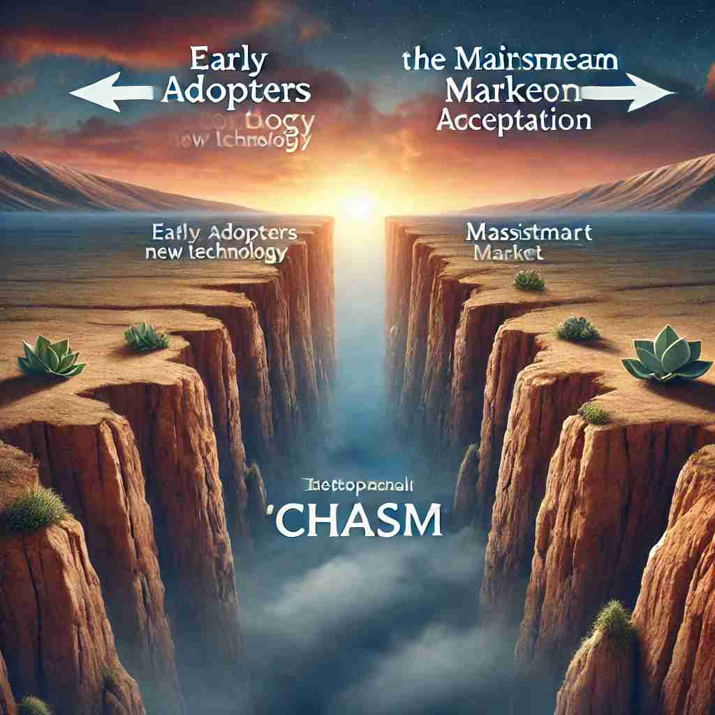 이 개념은 기술이나 제품이 초기 단계에서 성공적인 도입을 이룰지라도, 실제로 주류 시장에서 자리 잡는 데 큰 어려움을 겪을 수 있음을 강조합니다. 초기 수용자들은 새로운 기술에 대해 호기심이 많고 리스크를 감수하는 경향이 있지만, 주류 시장은 훨씬 더 신중하고 실질적인 가치와 증거를 중시합니다. 따라서 기술 또는 제품이 성공적으로 자리 잡기 위해서는 이 캐즘을 넘어서야 하며, 이 과정은 매우 어렵고 전략적으로 중요한 도전 과제입니다.