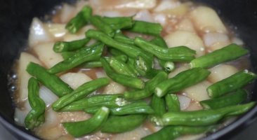 양파, 완두콩을 넣어 양념이 모두 사라질 때까지 졸여주세요.